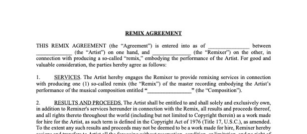 This is a 2-page template remix agreement, between an artist and a remixer, intended for situations where an artist is paying a remixer a flat fee, in exchange for buying out all rights to the remix.